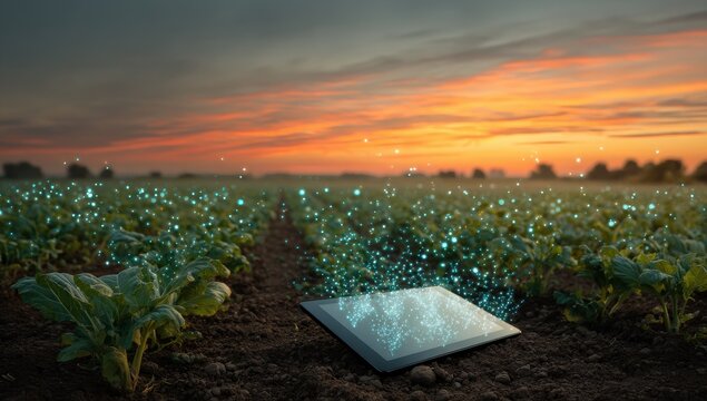 A tablet computer sits in the middle of an empty field, surrounded by numerous glowing data points.