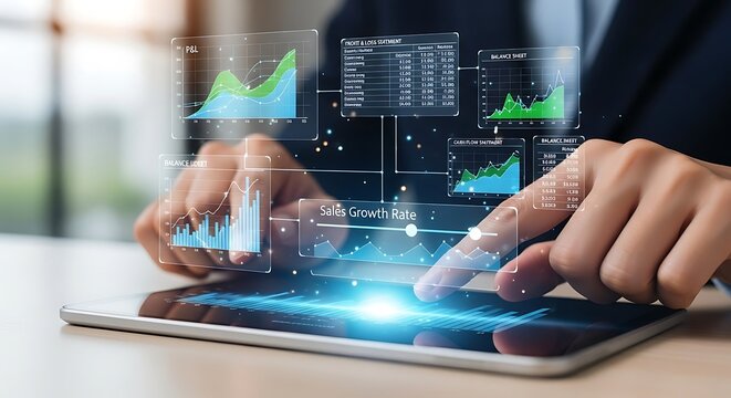 Interactive Data Analysis and Business Chart Visualization on Virtual Screen.