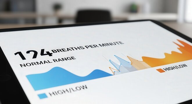 A finger interacts with a digital tablet displaying a fluctuating pink data visualization graph on a dark screen