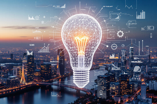 Futuristic light bulb hologram over modern city skyline at dusk.