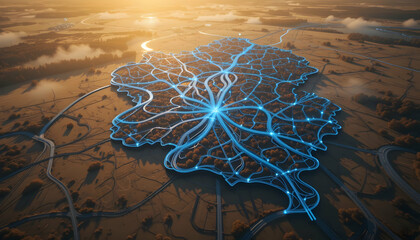 Expansive aerial view showcasing a sprawling coastal city with intricate urban infrastructure and interconnected blue network lines over land and sea