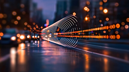 Futuristic night scene with data streams over a road. Orange and blue light trails, cybernetic concepts