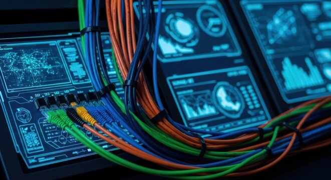 Close-up of tangled network cables draped over glowing digital displays, showcasing network data