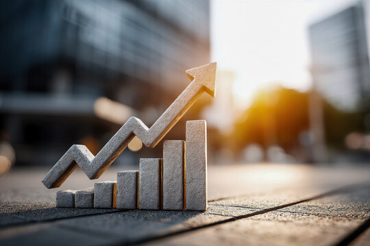 Rising bar graphs illustrate financial growth against a world map and a bright sunrise over a city skyline