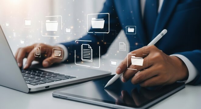 Business professional using laptop and digital tablet with file management icons. Futuristic digital workspace concept. Tech-savvy professional organizing data.