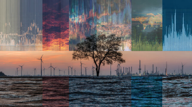 Lone tree stands amidst rising waters, symbolizing climate change impacts, with wind turbines and industrial structures background. Data visualizations overlay scene, highlighting climate science