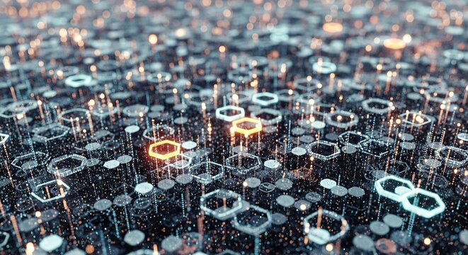 Nighttime urban cityscape with illuminated streets and hexagonal zones highlighting infrastructure in a metropolitan area