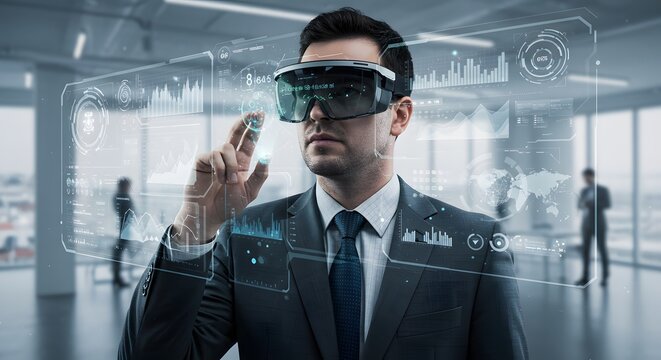 Man in suit using augmented reality headset with data overlay in modern office environment showing graphs