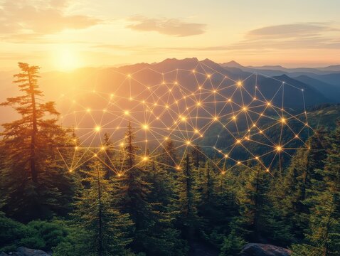 Stunning mountain peak landscape with vibrant green forest and dynamic data visualization overlays, perfect for illustrating environmental technology solutions