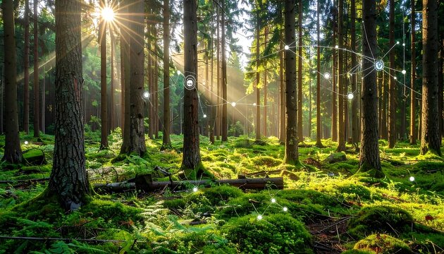 Sunlit forest with mossy ground and network nodes overlayed on the trees