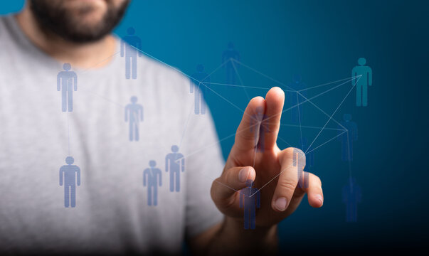 Person connecting with people via a digital network, social media, or data visualization. Concept of connection