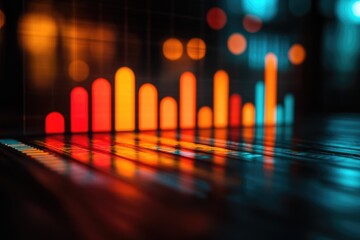 A vibrant, futuristic bar graph displays data trends with colorful bars and glowing lines, set against a dark background.