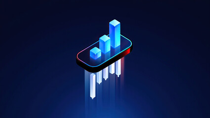 Isometric Illustration of a Glowing Bar Graph on a Smartphone Screen with Light Rays Against a Dark Blue Background for Data Visualization
