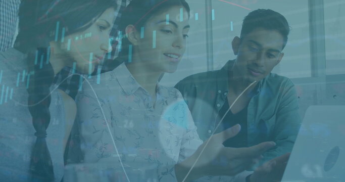Image of financial data processing over diverse business people in office