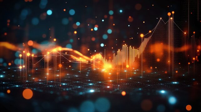 Abstract digital data visualization with glowing orange and blue points, waveforms, and rising bar charts representing dynamic information flow in a dark space