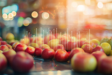 Grocery Cart Analytics: A close-up of a shopping cart filled with fresh produce, with an overlay of data visualization, showcasing a trend of rising demand in the grocery sector.