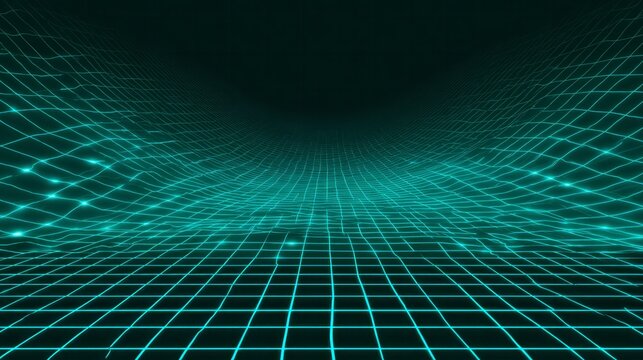 Fluorescent grid surface extends into a dark digital void with undulating geometry