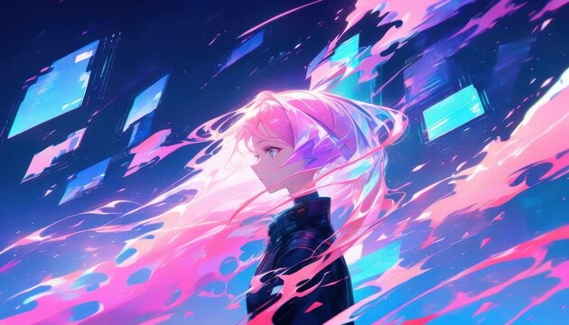 Pink hair anime girl standing in a dark void filled with floating digital screens