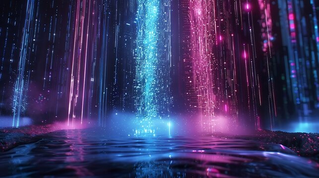 A cascading waterfall flows over moss-covered rocks in a lush green forest, with digital code cascading through the scene.