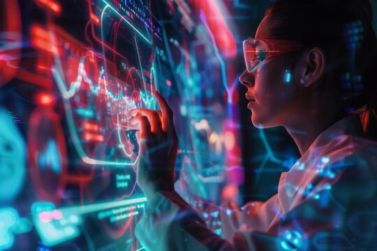 Woman analyzing data with futuristic visual effects