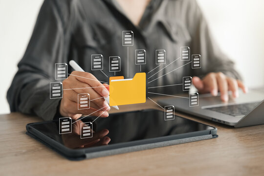 Document management system concept, business woman using laptop, folders and document icon software, online document database file management Powerful company information Search and archive.