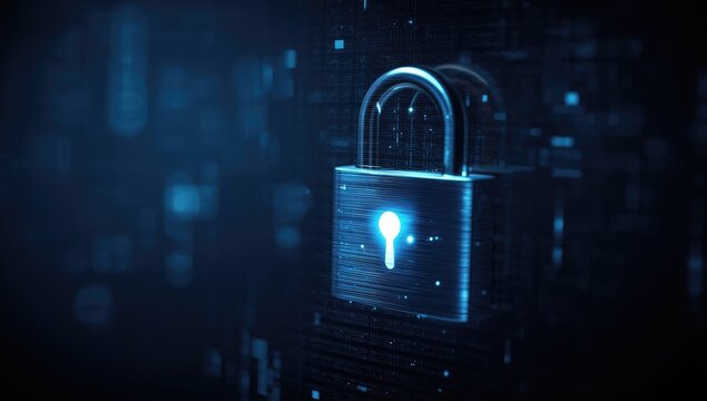 Secure digital padlock with glowing blue circuit lines and keyhole