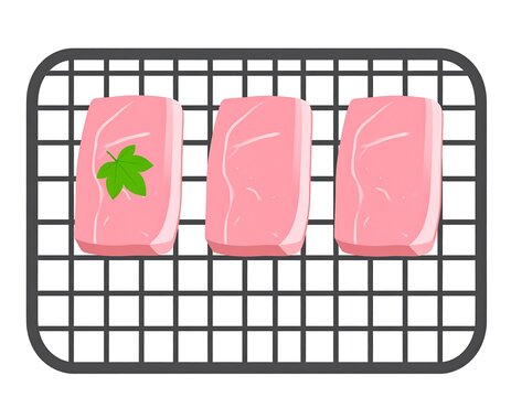 Graphic illustration of three pink meat pieces, one with a green leaf, arranged on a black square grid, viewed from above