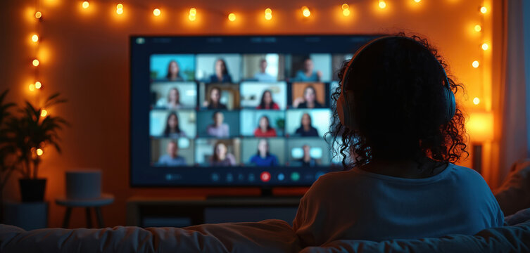 Woman with headphones watches video conference call on TV screen. Many people appear in grid view on display. Indoor scene with warm fairy lights.