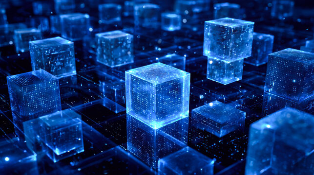 Futuristic digital cube network with glowing neon blue lights and data points distribution