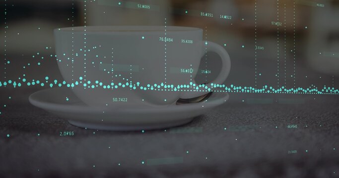 Displaying white ceramic teacup and saucer with teaspoon at cafe table, teal data overlay