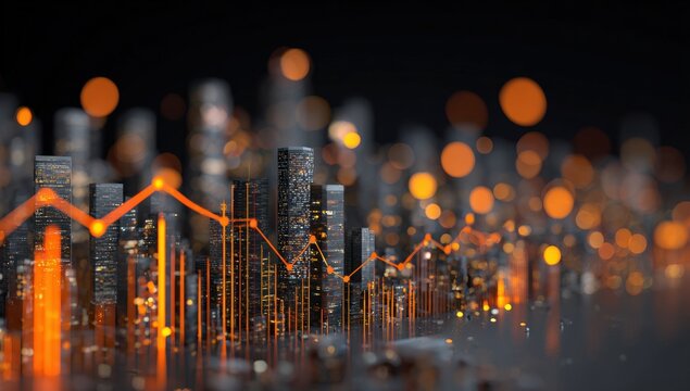 Translucent urban glass facade with green rising financial chart overlay showing growth