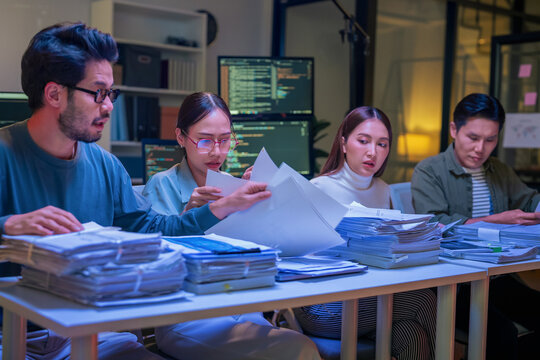 Asian programmer team is intensely working late night in an office, collaboratively coding AI train systems and AI agents at an agile hackathon workshop, using monitor screens to brainstorm and discus