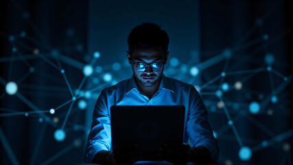 Businesswoman working on laptop with digital security lock icon in a dimly lit office