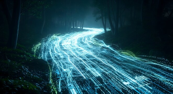 Glowing bokeh drifting over digital datastream with luminescent particles and matrix lines