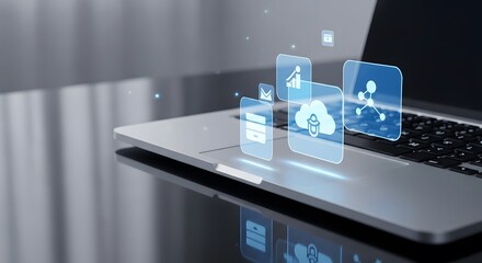 Futuristic Laptop with Floating Holographic Cloud and Network Icons