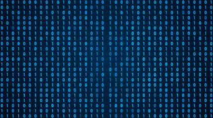 Blue digital binary code with rows of ones and zeros on a dark background, representing data, programming, and computer technology