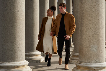 Couple running while holding hands between columns