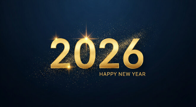 Golden number 2026 with particles on a dark blue background. Symbolizes upcoming New Year, celebration, and festive atmosphere, suitable for greeting card