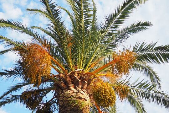 Ripening dates fruit on a palm tree branches, Phoenix dactylifera, commonly known as the date palm, a flowering-plant species in the palm family, Arecaceae, cultivated for edible sweet fruit of dates