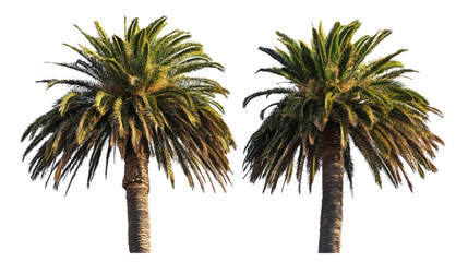 Three date palm trees against a white background.  The palm trees are different shades of brown and green, showcasing varying degrees of health or dryness
