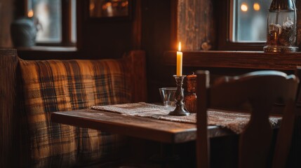 establishment. A cozy restaurant setting with a table for two, illuminated by warm candlelight and soft ambient glow. lifestyle magazines.