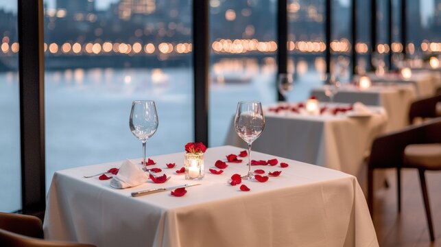 Elegant table setup glasses of champagne drinks and cutlery with candle light in luxury restaurant. Romantic dinner date on vacation concept.