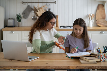Indignant woman tutor with laptop helping teenage girl to prepare for school olympiad in mathematics at home. Thoughtful schoolgirl doing homework under supervision of mother sits at table in kitchen