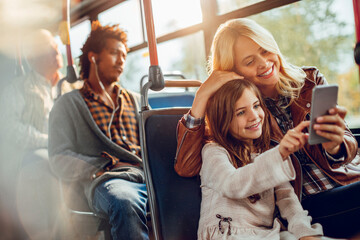 Happy mom with teen daughter using phone together at home, watching social media videos, doing online shopping on smartphone sitting on sofa together