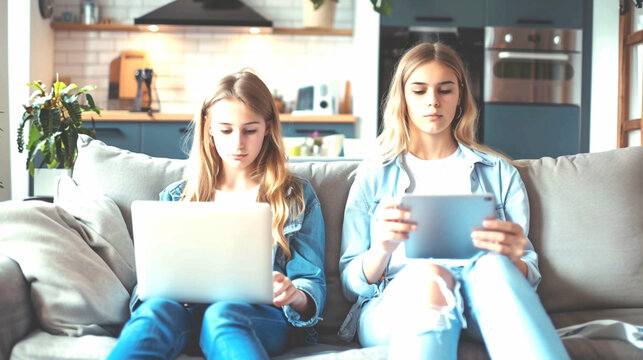 Mother sitting on sofa with laptop spying on teen daughter using cellphone, mom and kid spending leisure time together on devices. Parental control and smartphone generation