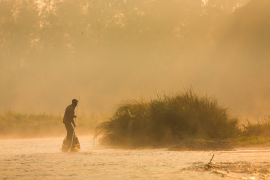 Chinese ink painting style image of a solitary fisherman rowing a boat at dawn on a misty lake