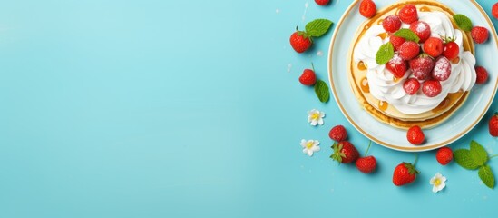 A top view of a plate with pancakes topped with whipped cream strawberries mint and sweet cherries on a bright blue background Ample copy space available