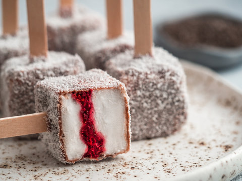 Homemade raw lamington ice cream pops on light background. Australian sweet dessert lamington with chia and raspberries jam, chocolate and cocoa coat. Vegan food recipe and idea. Copy space. Close up