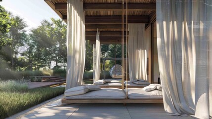luxurious daybed with a canopy draped in sheer fabric, nestled in a secluded corner of a lush garden, creating a private oasis for relaxation or meditation