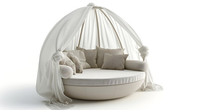 A white round daybed with a canopy and pillows.